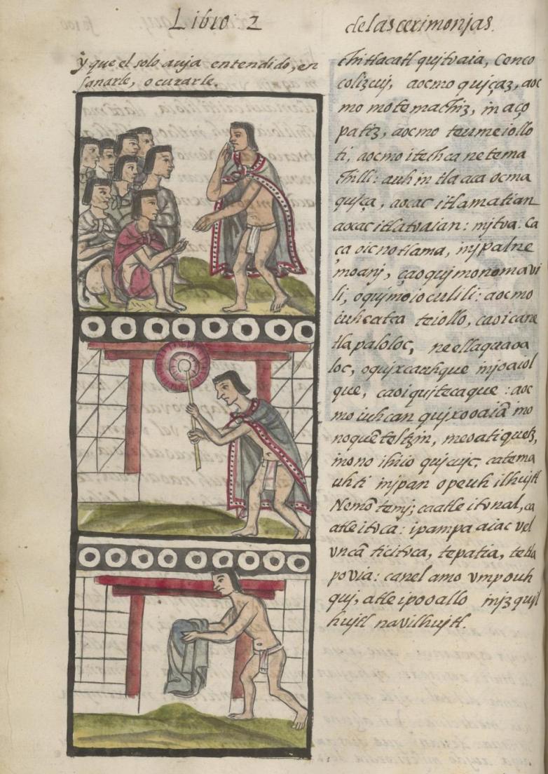 Historia general de las cosas de Nueva España (Florentine Codex), Book 2, Fol. 106r (depicting how people were instructed and temples were cleaned during Nemontemi, the last 5 days of the Aztec solar calendar), Nahua and Spanish; AD 1575–77. Mexico.