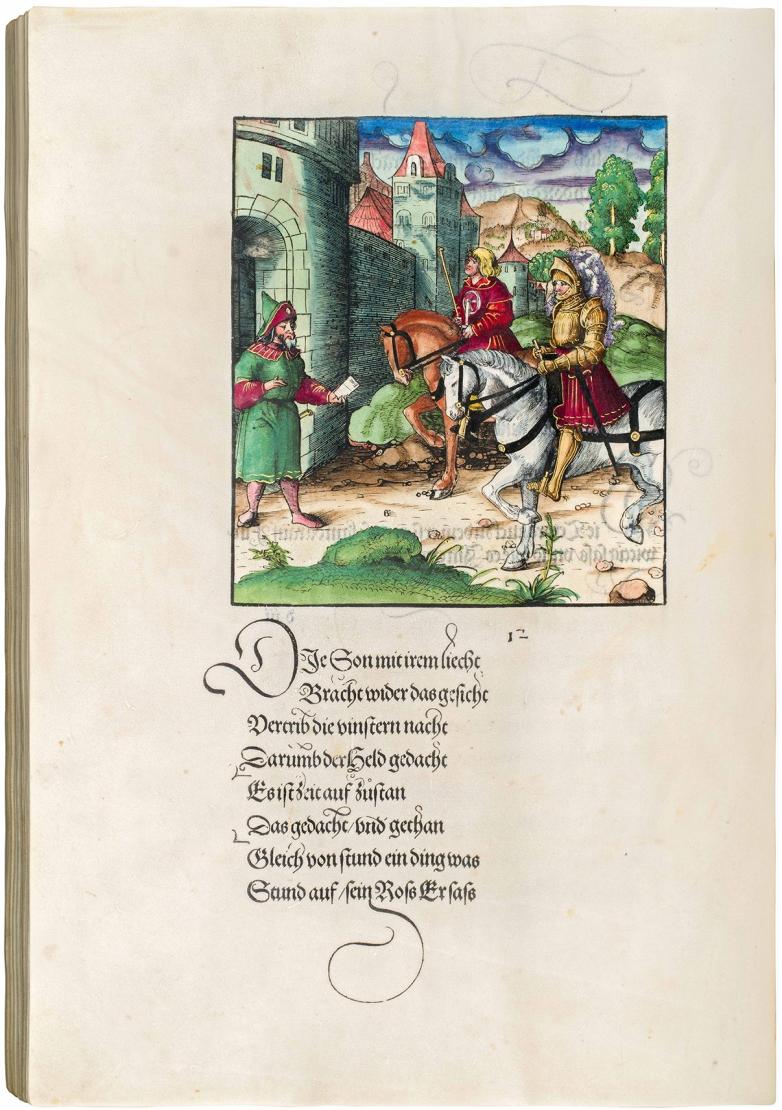 These scenes of adventure were designed by some of the best-known woodcut artists of the time – Hans Burgkmair, Hans Schäufelein, Leonhard Beck, and others – and the compilation of the cuts, begun in 1511, took until 1517 to complete. Unlike its inclusion in the Stuttgart Antiquariatsmesse, however, this book was not initially intended for sale: the Emperor rather meant it as a memorial of his great achievements, taking many years to fine-tune its stunning design. Though 40 copies of the first edition were printed on vellum, only a few were coloured.