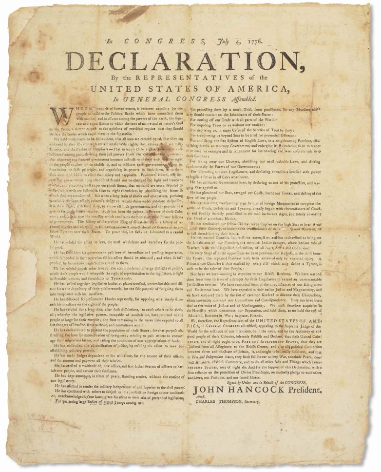 The Declaration of Independence – In Congress, July 4, 1776. [Exeter: Robert Luist Fowle, July, 1776.] Estimate: $700,000-900,000