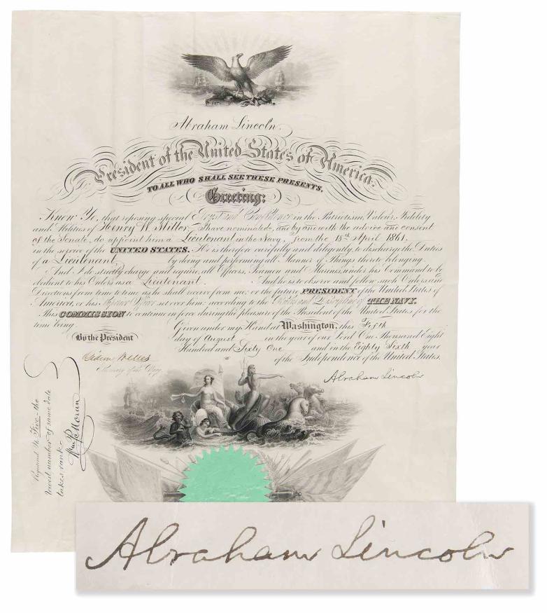 Highlights include two Abraham Lincoln items. The first is a rare Lincoln check dated February 16, 1859, payable to Johnson & Bradford for $72.10. Also going under the hammer are naval documents signed by Lincoln and James Buchanan.
