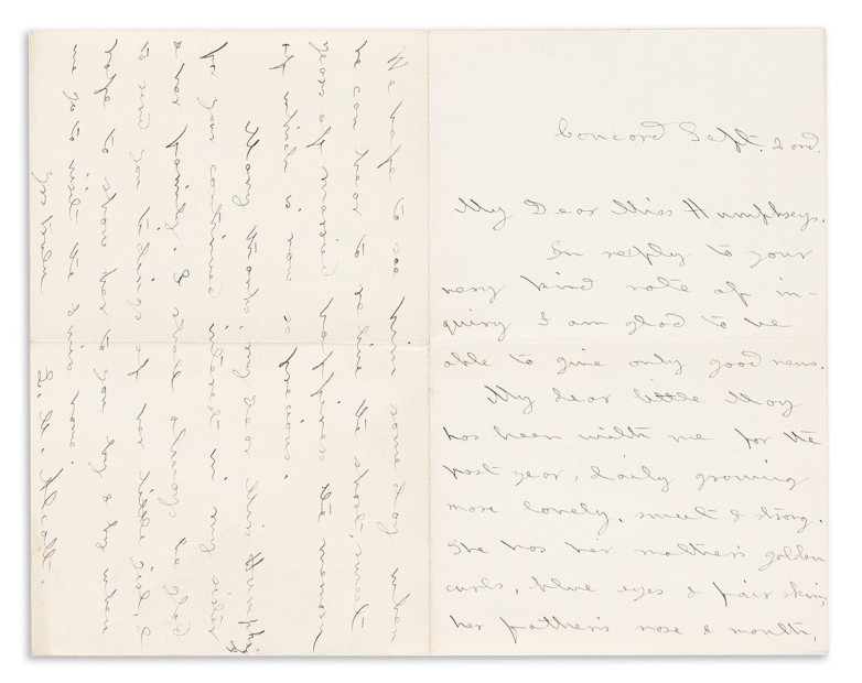 The three autograph signed letters (estimate: $3,000 - $4,000) by Alcott to Ellen Humphreys in 1880, 1881, and 1885 from Concord and Boston are each written over four pages, two with envelopes. She writes to a British friend of her deceased sister Abigail May Alcott Nieriker (1840-1879) who died shortly after giving birth to her first child, Louisa May 'Lulu' Nieriker.