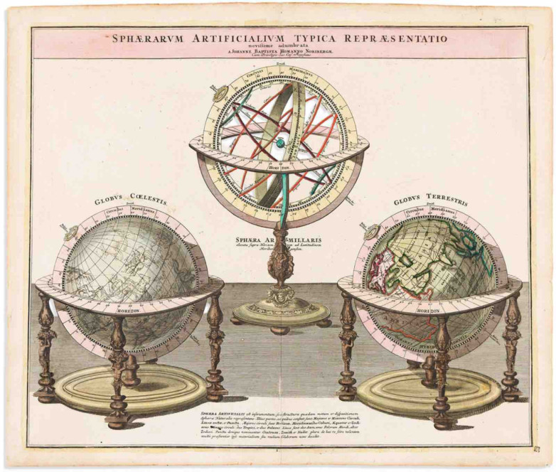 Johann Baptist Homann. Sphaerarum Artificialium Typica Repraesentatio Novissime Adumbrata, Nuremberg, circa 1720.Double-page engraving of an armillary sphere and a matching pair of terrestrial and celestial globes.