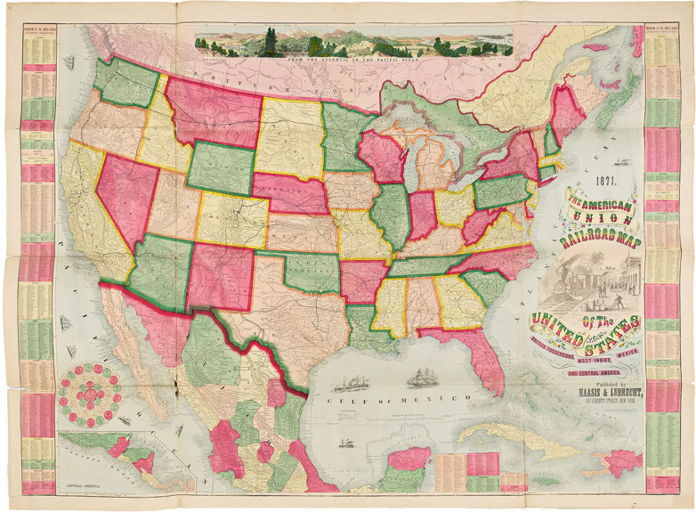 * Haasis & Lubrecht's The American Union Railroad Map Of The United States, British Possessions, West Indies, Mexico, And Central America, large wax-engraved map of the United States illustrating the mass network of 19thcentury railroad lines. New York, 1871 (estimate $4,000-$6,000).