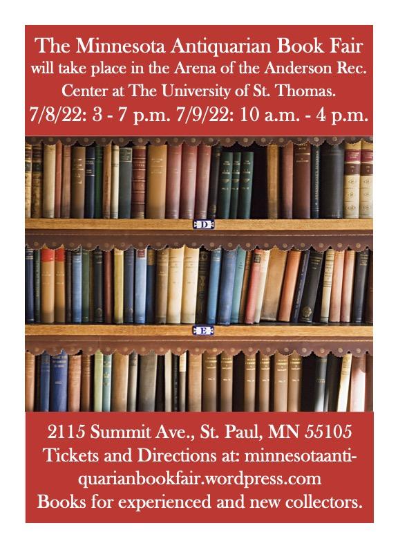 The Minnesota Virtual Antiquarian Book Fair will take place on an online platform beginning at 11:00 a.m. central on July 7th, and open continuously until 7:00 p.m. on July 9th.