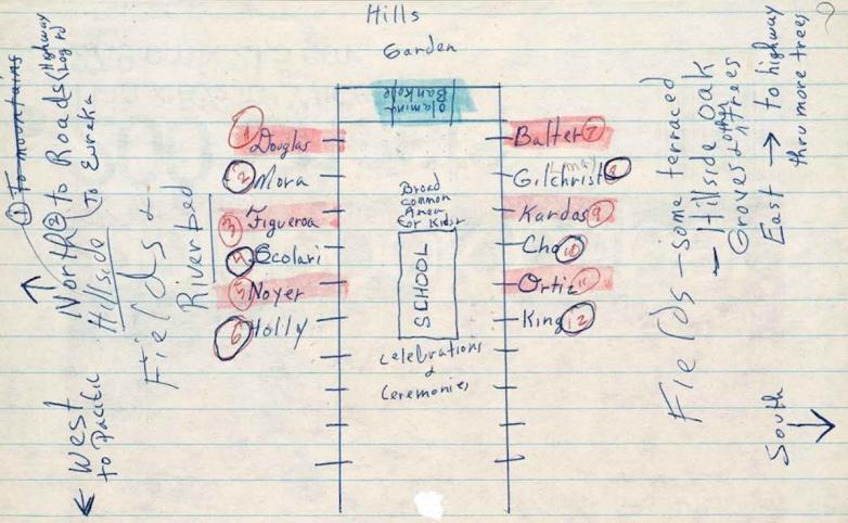 Octavia E. Butler, Map of Acorn from notes for Parable of the Talents, ca. 1994. (Detail) Manuscript on binder paper, 8 1/2 x 11 in.