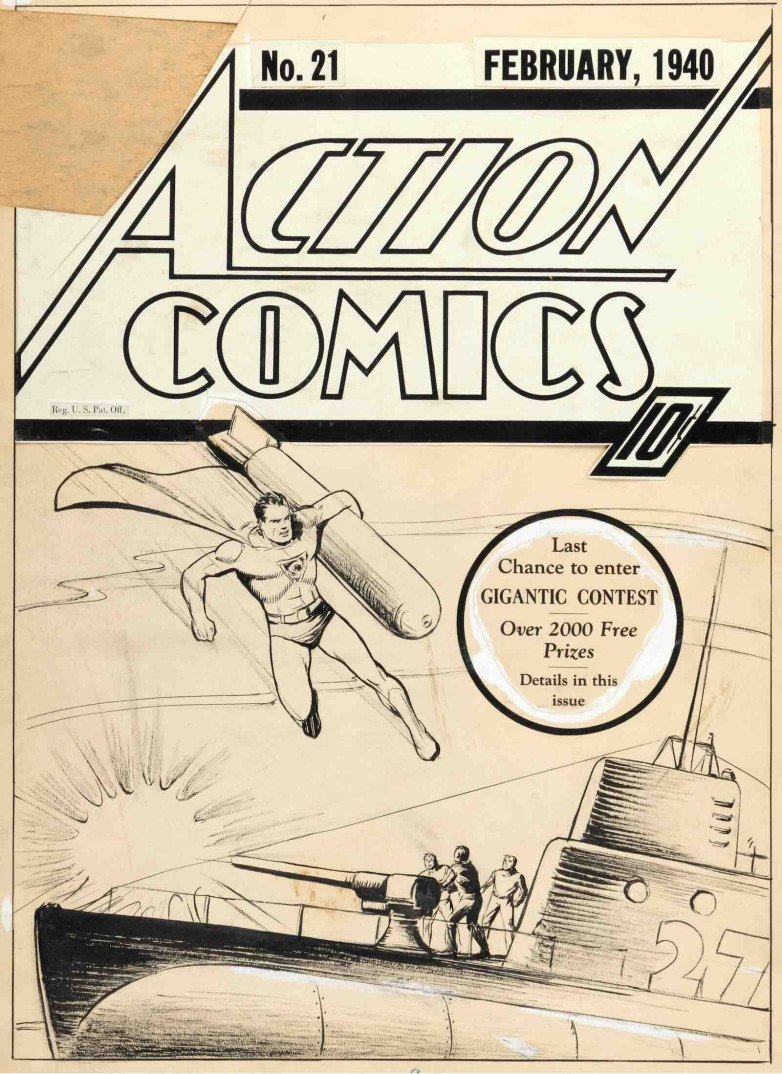 The cover of Action Comics No. 21 drawn by Joe Shuster who co-created the character Superman with Jerry Siegel leads Heritage Auctions' February 27–March 1 Comic Art sale.