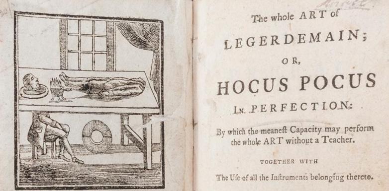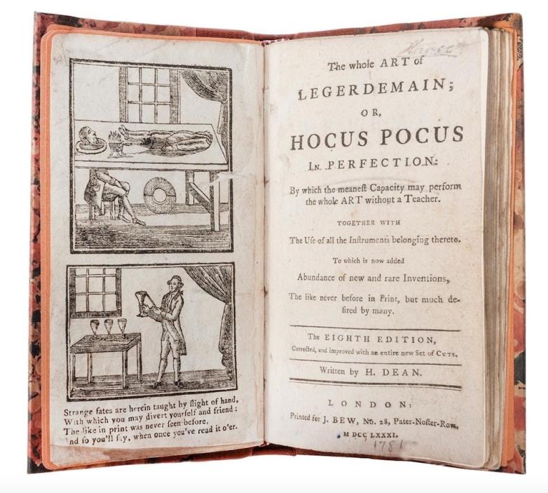 • Lot #474, Henry Dean's The Whole Art of Legerdemain; or Hocus Pocus in Perfection, is estimated at $2,000-3,000. This eighth edition was published in London by J. Bew in 1781. It features a woodcut frontispiece, woodcut in-text conjuring illustrations, and the ownership signature of a Horace Brotherton, dated 1873, to the front flyleaf.