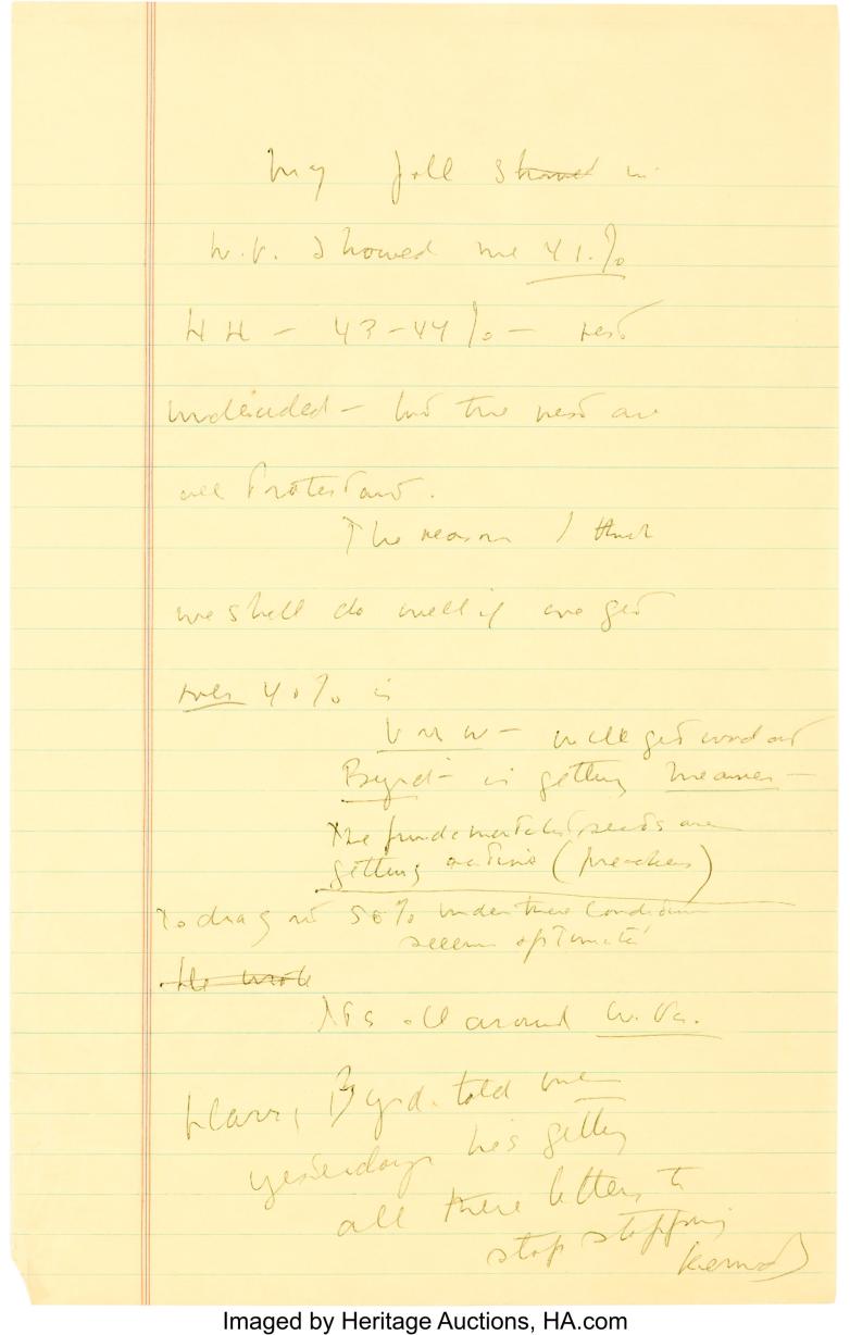 John F. Kennedy Uncensored Campaign Notes Made While Suffering from Laryngitis is a trove of 78 separate pages that sold for $25,000 to lead the sale. On these handwritten pages, the 35th American president addressed a number of topics, including his philosophies, campaign plans and his frustration with asking and answering questions with his staff. He cited specific events, such as his Sept. 12, 1960 speech to the Greater Houston Ministerial Association at the Rice Hotel, a performance that was important to his campaign and is widely considered one of his best speeches. He also alluded to specific people and reveals thoughts about the campaign, such as in his suggestion that it might be better not publicly debate Minnesota Senator Hubert Humphrey, because of the impact laryngitis had had on his voice, and the fact that Humphrey is "pretty good with a crowd.”