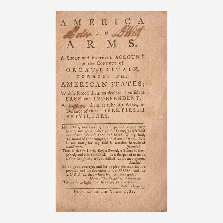 Freeman’s July 25 Books and Manuscripts auction is led by more than a hundred Americana lots, almost 60 of which are either examples from the signers of the Declaration of Independence or related to that document. The leading lot is America in Arms, an extremely rare anti-British pamphlet published during the American Revolution, one of only two known copies.