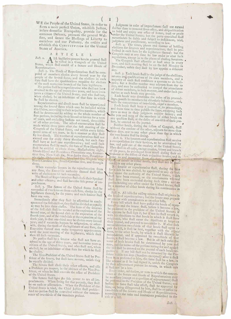 Going under the hammer at Brunk Auctions this weekend is a rare original printed, signed archetype of the Constitution of the United States which was recently discovered after being tucked away for generations at Hayes Plantation in Edenton, North Carolina, an 1821 National Historic Landmark.