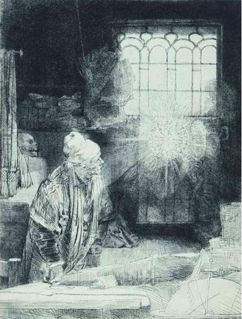 Inspired by the German legend based on the historical alchemist Johann Georg Faust, Rembrandt never gave the puzzling c. 1652 etching a name but it has come to be known as A Scholar in His Study ('Faust'). It features an elderly learned figure in his robes, standing by the desk of his study, surrounded by various items including a skull and a glob, and looking towards a radiant disk-shaped apparition on which are inscibed various letters.