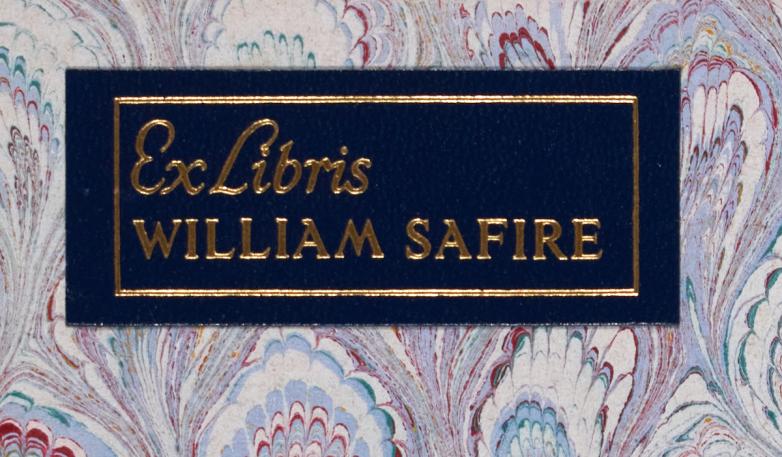 Broadly, Safire’s interest in presidential history and his devotion to language shine through in the twenty lots that bear his provenance. In the former category: a 1777 Journals of Congress (incomplete), a Lincoln-signed commission from 1861, and a bound volume of Nixon and Kennedy campaign speeches, inscribed to Safire by Nixon. In the latter: a 1790 first edition of Noah Webster’s A Collection of Essays and Fugitiv Writings. On Moral, Historical, Political and Literary Subjects, a 1785 first edition of James Boswell’s The Journal of a Tour to the Hebrides, with Samuel Johnson, and a 1982 first printing of Safire’s own What’s the Good Word? bound in full black morocco with marbled endpapers.
