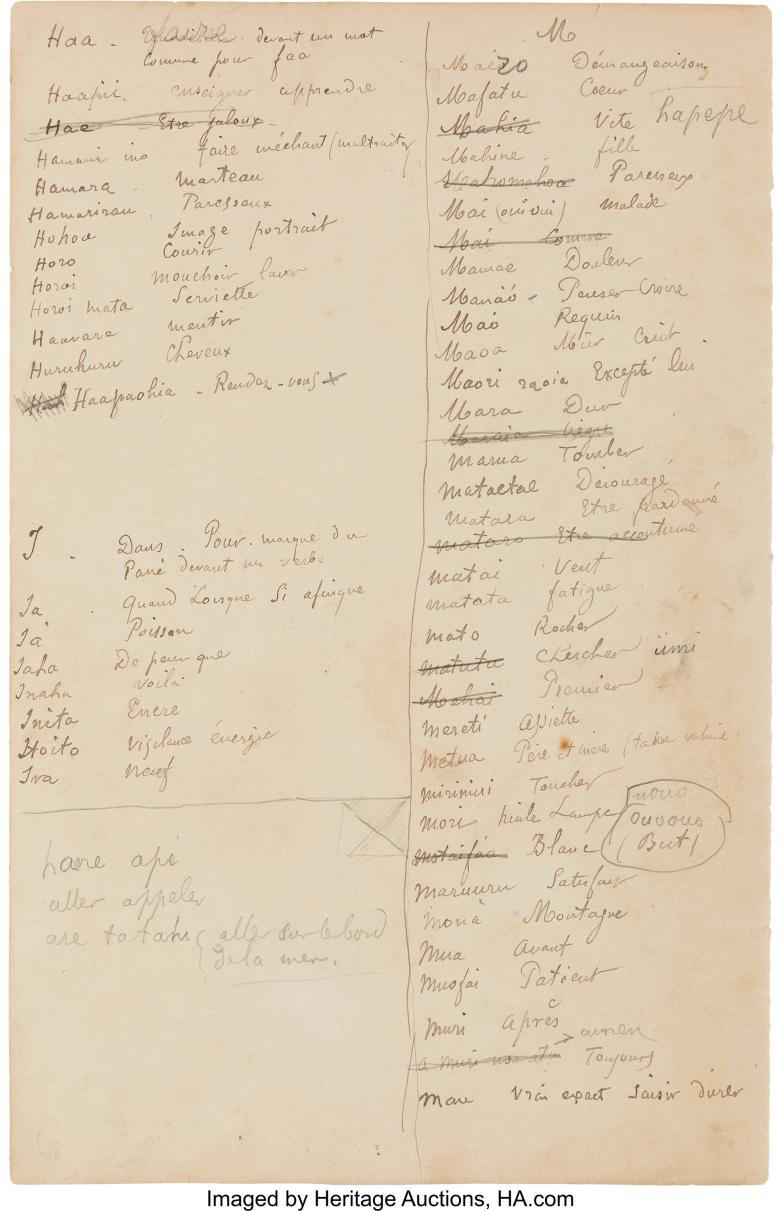 The four-page dictionary, which lists approximately 246 Tahitian/Polynesian words and their French translations, will be offered among a strong selection of artists’ letters and sketches known as the Maurice Car Collection of Arts and Sciences at Heritage Auctions in New York. The auctioneer believes the artist “probably created this manuscript during one of the two periods of time he lived in Tahiti.” Examples of the words listed in the dictionary are "Ani" for the French word "Demander" (request) and "Ta ahu" for "Habiller" (dress). Gauguin ultimately gave up on Tahiti, though, moving to the French Polynesian island of Hiva Oa in 1901; he died there two years later.
