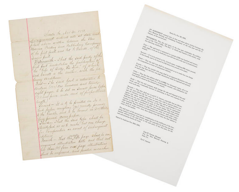 Even more rare than the first edition? That original book contract between Garrett and the New Mexican Printing and Publishing Company, handwritten on lined legal folio and signed by Garrett, which is headed to auction in Los Angeles later this week, estimated at $8,000-12,000.