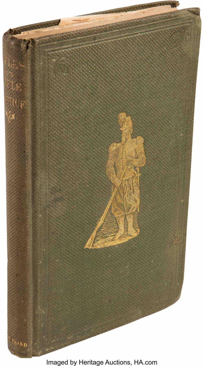 Any book signed by presidential assassin John Wilkes Booth would be intriguing, but one titled Rifles and Rifle Practice (1859) is positively spine-chilling. The book, featuring a gilt-stamped image of a solider on the front cover and containing diagrams, illustrations, and charts related to the art of shooting, clearly signals the impeding war. Indeed, Booth’s inscription, “John Wilkes Booth, May 10th 1861,” was penned less than a month after Fort Sumter.