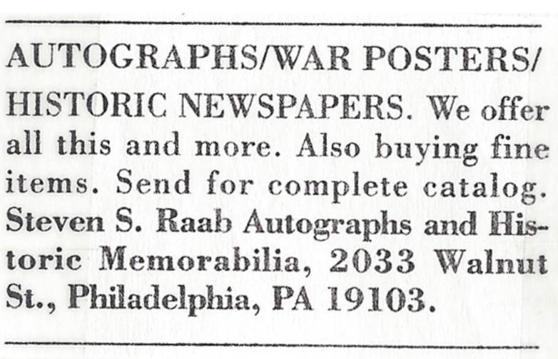 While these thoughts were churning in my mind, my mother died, and I felt I needed something to keep me busy. So I decided to issue catalogs to sell my expendable stuff. Thus was born Steven S. Raab Autographs. I did all the work on it myself. Catalog 1 contained hundreds of pieces. I wrote all the descriptions, Xeroxed the pages, and stapled the sheets together. Nothing sophisticated about it. It appeared in March 1990. I took out ads in autograph magazines inviting people to send for catalogs and had a good response. Before the Internet was an active tool for dealers, paper was the way to buy, sell, and advertise. The best way to reach the market was through print publications and direct mail, a big difference from today’s online marketplace and digital advertising and marketing. For this first ad, I only took in $5,000, which was discouraging. I began to question whether becoming a dealer was such a good idea after all.