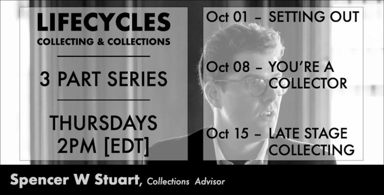 Spencer W Stuart, Collections Advisor, is pleased to announce an expanded, three-part format of Lifecycles: Collecting & Collections. These one-hour webinars will be expanding on his introductory sessions delivered in April and June of this year, taking a deeper dive into the three distinct phases of collecting outlined in his Lifecycles program. With more case studies and methodologies, this Series will offer a multi-perspectival approach to building collections of fine art and rare print material.