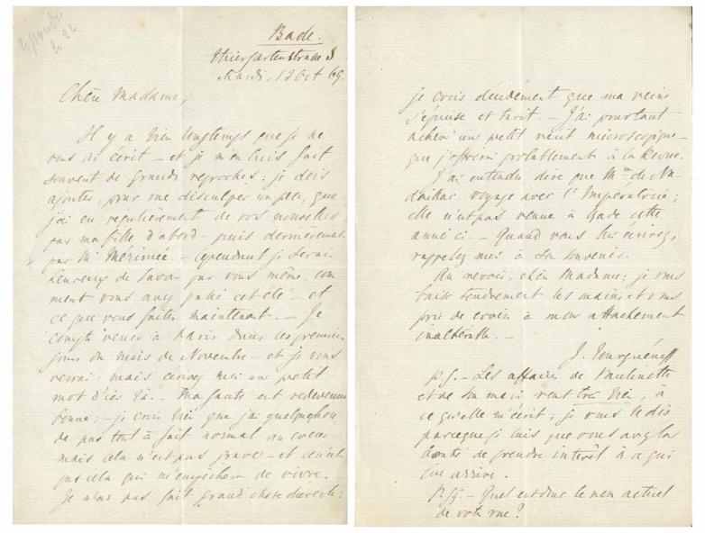 Turgenev wrote to French socialite Valentine Delessert on October 12, 1869 from Baden, Germany.