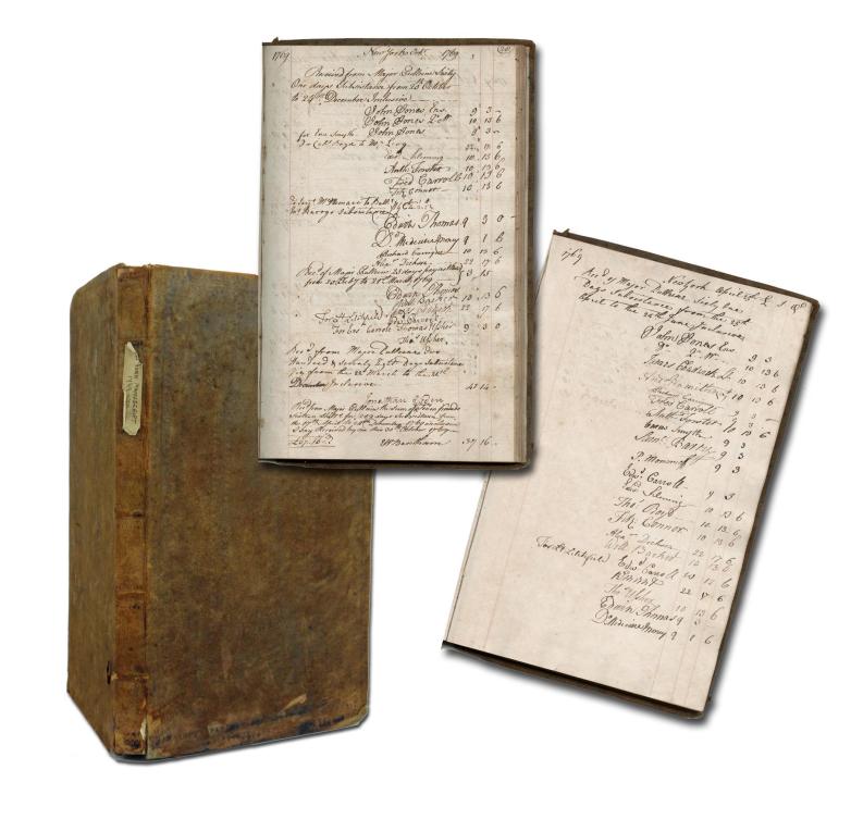Leather-bound ledger from 1769-1770, a paymaster’s account book from a New York regiment that remained loyal to King George III during the American Revolution. Est. $10,000-12,000.