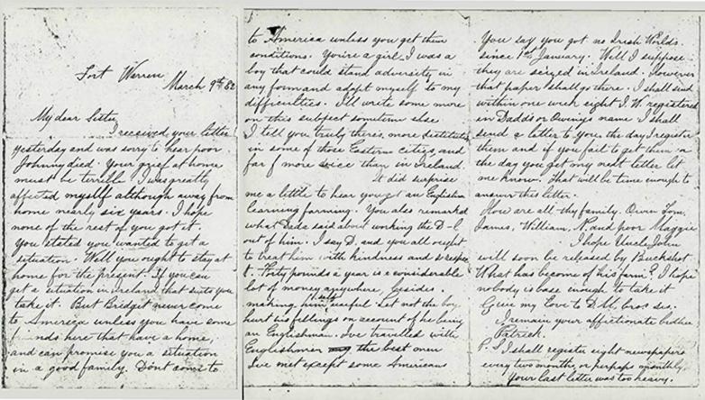 Letter from Patrick Callaghan, Fort Warren, Boston, Massachusetts, to his sister, Bridget Callaghan, Fallow, Kilmacthomas, Waterford (county), March 9, 1882.