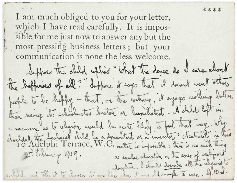 Autograph note (London, February 2, 1909) signed "G.B.S." to A.D. Corrick Jr., on a postcard discussing the importance of religious education to establishing a pupil's moral principles, preprinted with message beginning "I am much obliged to you for your letter"