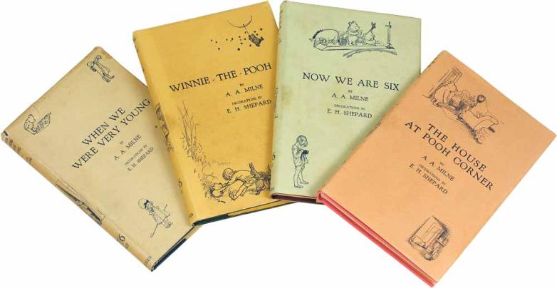 $65k This remarkable set of four Pooh first editions published between 1924 and 1928, all signed or inscribed by both the author, A. A. Milne, and the illustrator, E. H. Shepard, was likely “assembled as the books were published,” said the bookseller, as evidenced by gift inscriptions. The copy of When We Were Very Young contains an original ink drawing by Shepard reinterpreting his illustration on page 48 and manuscript poem inscriptions by both men on the free endpaper.