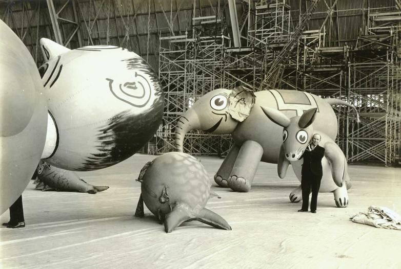Photograph of Tony Sarg in 1929 with some of the Macy’s Thanksgiving Day Parade balloons he designed.