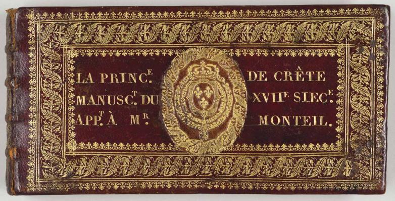 In addition to exquisite bindings, the Wrightsman collection is rich in important illustrated works, including the monumental four-volume set of La Fontaine’s Fables choisies printed in 1755–1759 with illustrations by Charles-Nicolas Cochin II after Jean-Baptiste Oudry. The Wrightsman copy is bound by Lemonnier for Louis Phélypeaux, duc de la Vrillière. One of the best-known books from the period is the so-called Regent’s book, the edition of Daphnis et Chloé printed in 1718 with engravings by Benoît Audran after Philippe II, duc d’Orléans. Wrightsman also had a volume of just the engravings, bound for Philippe II, with each print inscribed “régi française” (regent of France). Among the manuscripts produced for or dedicated to members of the royal family, one of the most interesting is the autograph manuscript of André Philidor’s opera-ballet La princesse de Crète. The manuscript, likely produced for the premiere of the opera in 1688, was bound for Louis XIV. One of the missing manuscripts from the Philidor Collection at the Paris Conservatory, the volume was in the possession of Amans Alexis Monteil and Mortimer L. Schiff.
