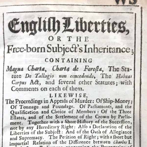 Straight out of Hobart, New York's booktown, bookseller Wm. H. Adams Antiquarian Books is bringing English Liberties or The Free-born Subject's Inheritance, printed by Eliz. Nutt and H. Gossling, 4th Edition, 1719. Price: $5,000
