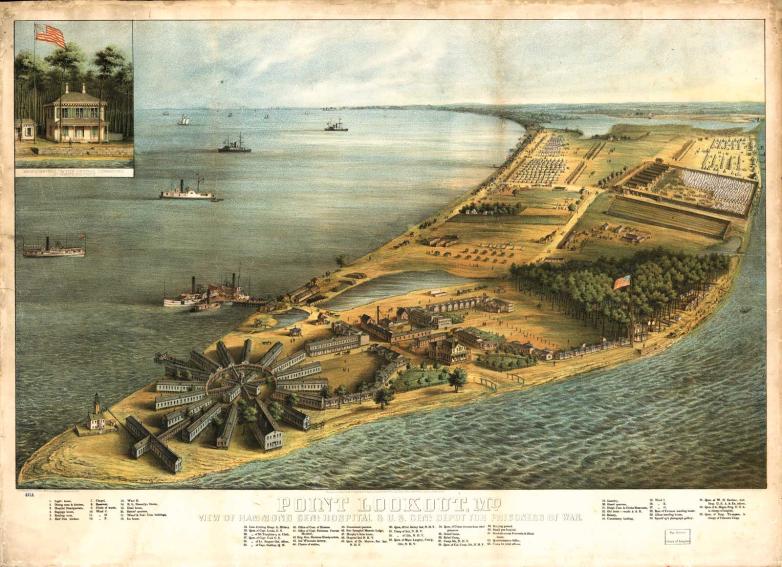 Located at the mouth of the Potomac River, the former Point Lookout resort became the home of a Union hospital (in the foreground), a tent garrison (at the top of the peninsula), and a palisaded prisoner-of-war camp. Some 50,000 Confederate soldiers were housed in the prison, which was originally built for 10,000. Although George Everett’s bird’s-eye view has some wonderful detailing and exquisite colors, the print hides the unsanitary conditions the prisoners endured.