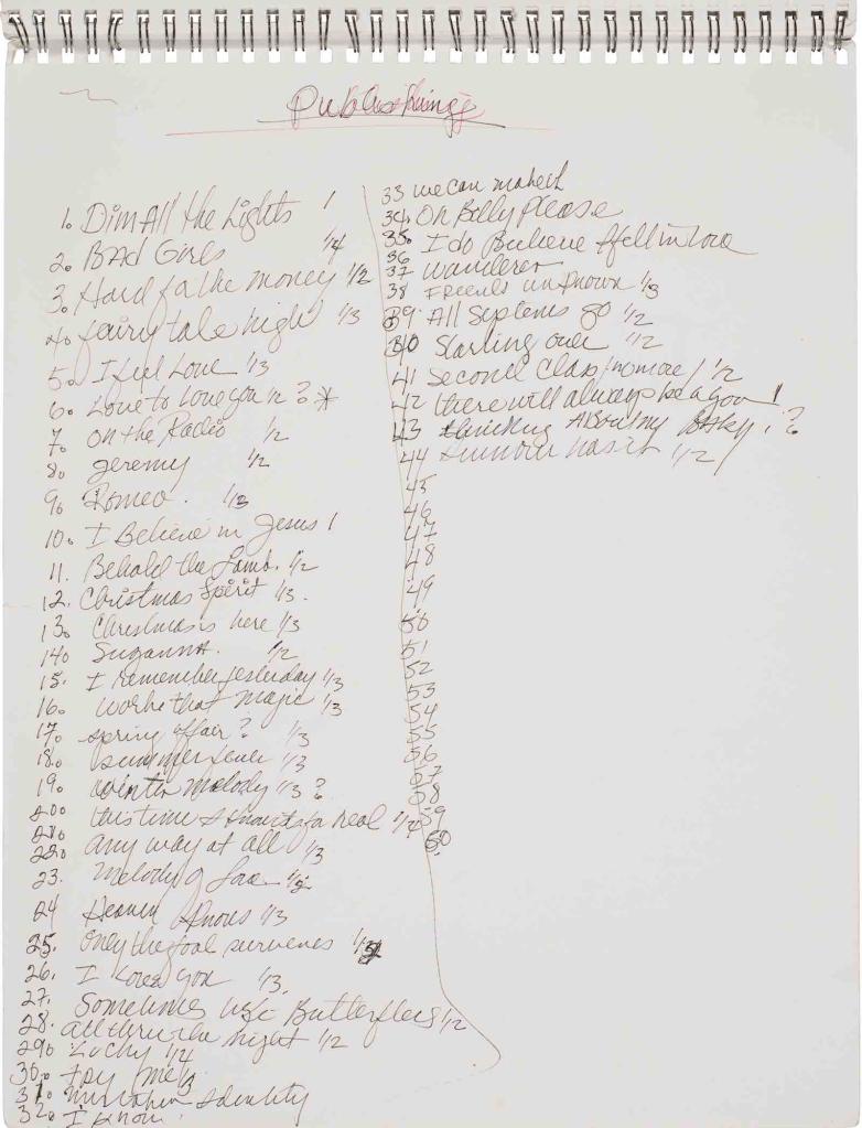 Manuscript notebook with sketches, lyris and list of Donna Summer songs, circa 1995