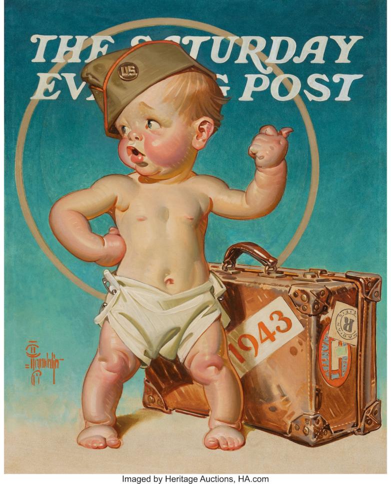 Dallas – It was meant to be Joseph Christian Leyendecker’s final cover for The Saturday Evening Post – the illustrator’s iconic New Year’s Baby, dressed only in a diaper and a soldier’s garrison cap, thumbing his way to the front as World War II raged on. But the 1943 painting never made its way to the magazine – or to the public’s view.
