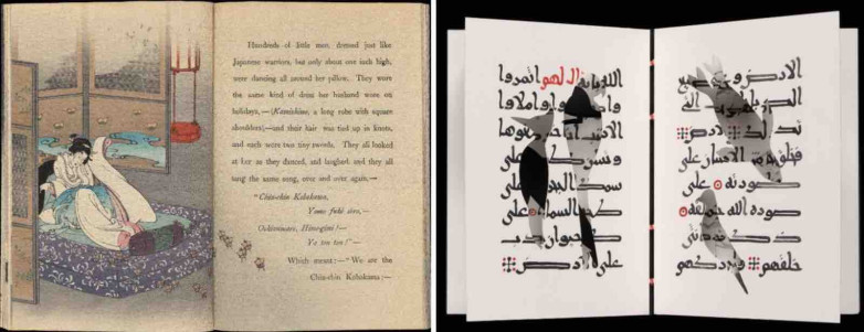 (L) Lafcadio Hearn, trans., Chin Chin Kobakama (The Toothpick Samurai). Tokyo: Hasegawa Takejirō, 1903. (R) Joumana Medlej, Anthropocene, Book I. London: Joumana Medlej, 2024.