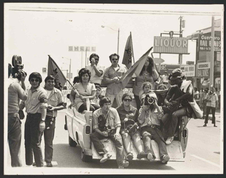• a photograph of journalists and protesters riding in the back of a pickup truck while covering a Chicano Movement protest ca. 1968-1975