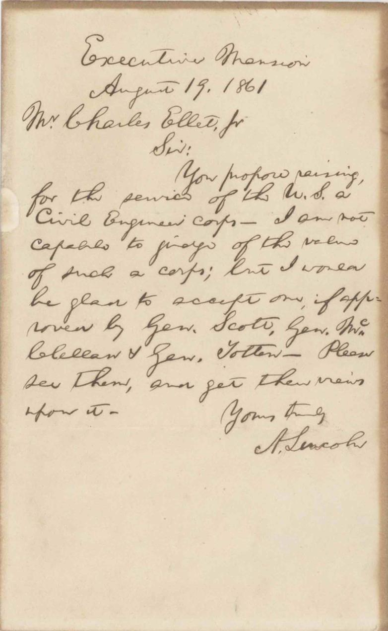 This letter is documentary evidence of McClellan’s mistreatment of Lincoln. As for Ellet, he then published a rebuke of McClellan, which caused newspapers to caricature his efforts. Ellet, as depicted in a contemporary political cartoon. When the Confederacy’s ironclad Merrimack virtually destroyed a fleet of Union boats in 1862, the generals would come to realize that Ellet had been right. Ellet served in the United States Ram Fleet during the Civil War, and less than a year after he received this letter from Lincoln, he died from wounds sustained in battle. His efforts to build a bigger and better Civil Engineers Corps were, however, successful. In 1867, the CEC formed under the command of the U.S. Navy and remains active today.