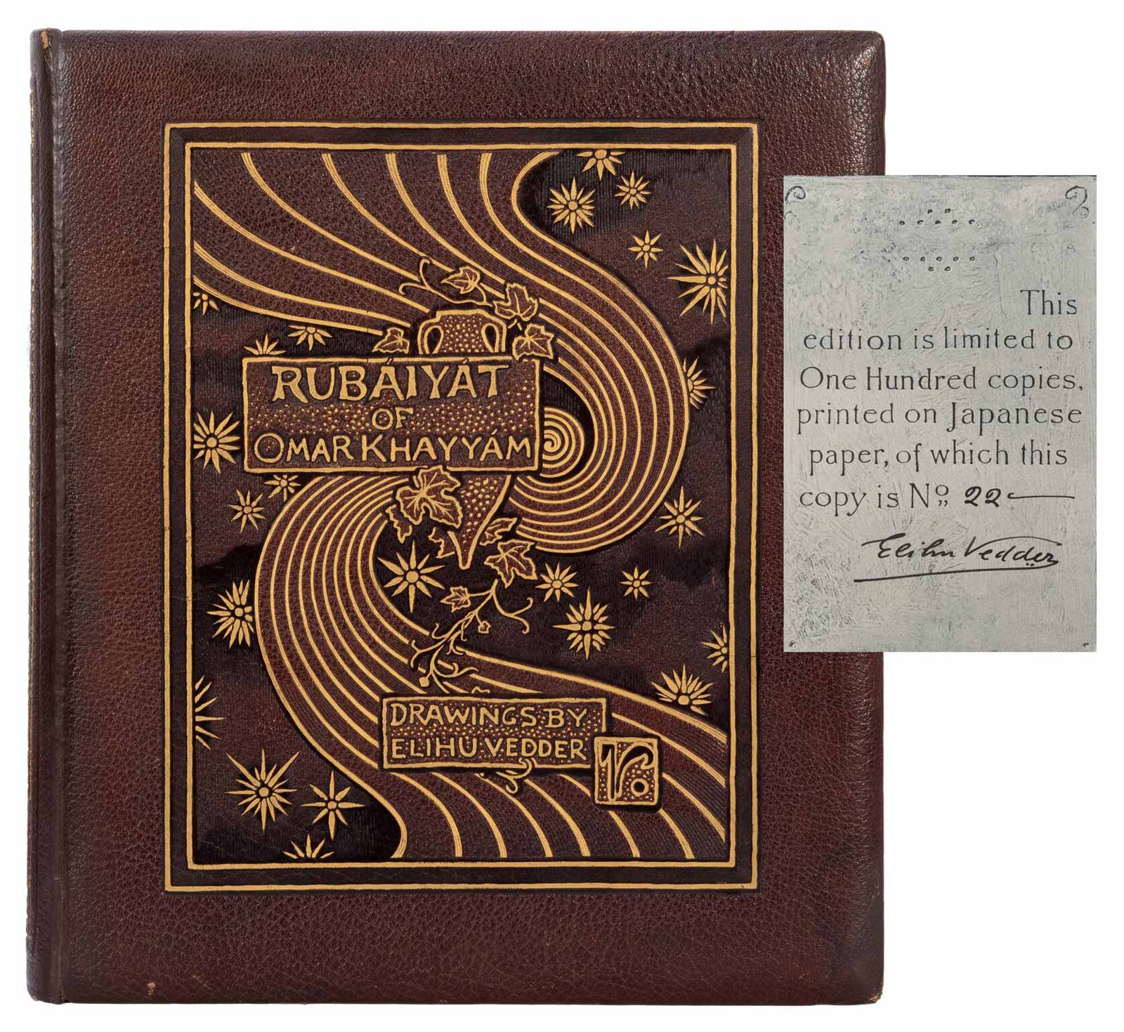 Photo Courtesy : potter & PotterThis first deluxe edition of Rubáiyát is No. 22 of 100 copies designed, illustrated, and signed by Elihu Vedder. “This copy features the same block text used in the legendary Sangorski & Sutcliffe jeweled binding for The Great Omar, which was bound for American aboard the Titanic,” Brink said. “The text itself is the exact text in that book, which is the rarest book in the world.”